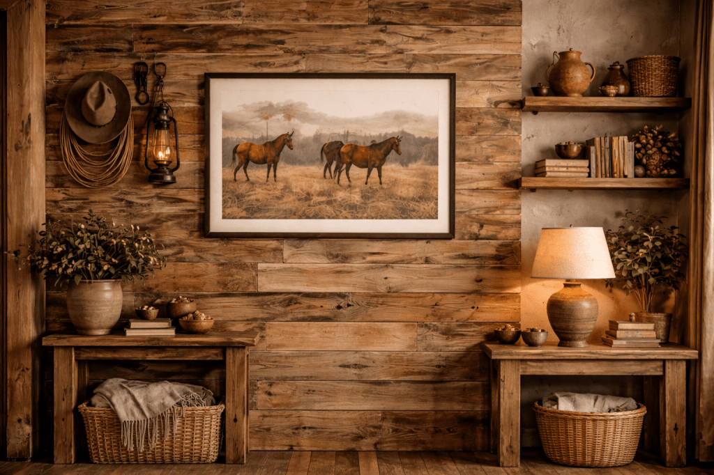 Une palette de tons naturels permet de poser une base élégante et intemporelle. Beige, sable, brun, terracotta… ces couleurs apaisent l’espace et laissent respirer la décoration, tout en évoquant subtilement l’univers western. L’idée n’est pas de tout assortir au millimètre près, mais de créer une harmonie qui donne envie de s’y poser, tout simplement.