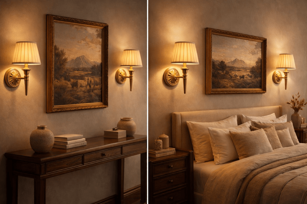 Wall sconces are best used as layered lighting, not the only light source. In living rooms and bedrooms, they create warm ambient light and eliminate dark corners. For full room brightness, pair them with ceiling lighting or table lamps.