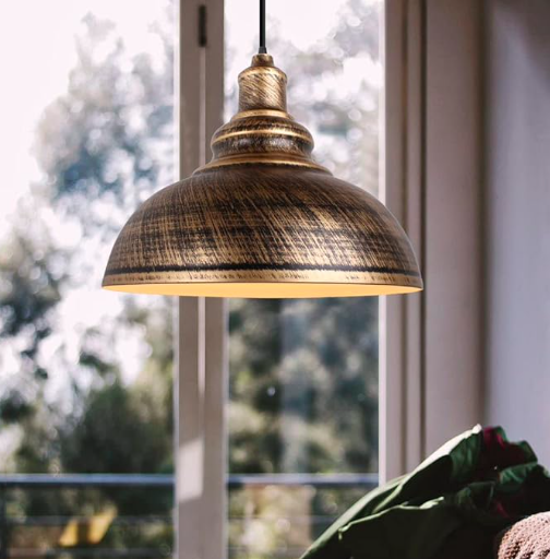 Une pièce forte au plafond structure la pièce et donne immédiatement le ton : métal patiné, formes vintage, lumière chaude